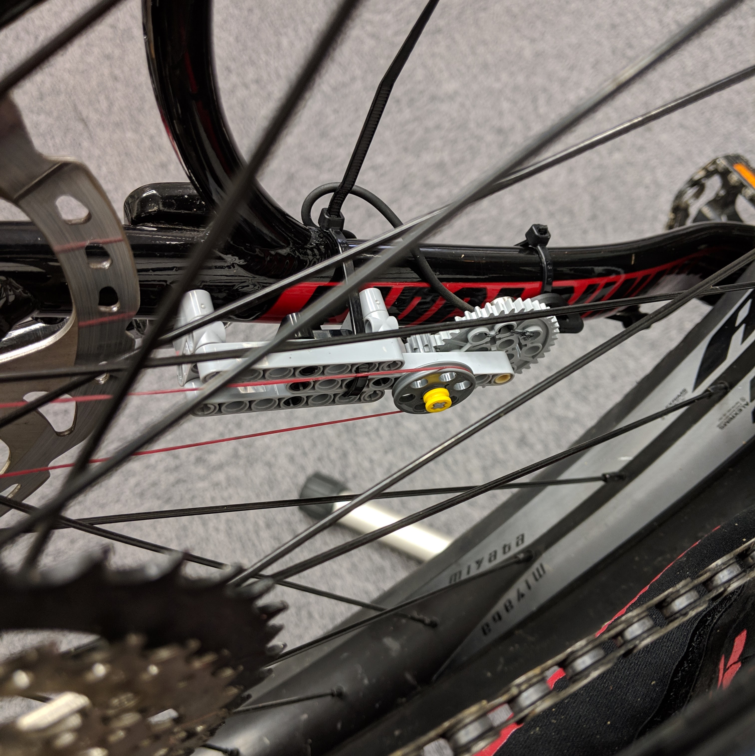 レゴの部品を組み合わせるのは簡単だが、スムースに動くように取り付けるには苦労する。Ridge Runnerのチェーン・ステーは湾曲しているし、スポークとの空間は狭く、ブレーキのディスクが迫っているからだ。あれこれブロックを組み替えては取り付け直し、なんとか安定して動作するようになった。減速機はチェーン・ステーにタイラップで留め、プーリーと後輪軸とは輪ゴムで繋いでいる。