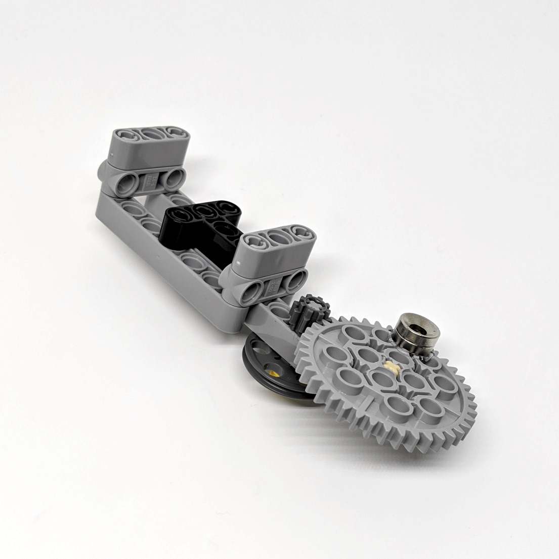 エラーを引き起こすか否かはともかくとして、急激な速度変化の影響を避けるためにも、実走に近いセンシングを行うほうが良いだろう。そこで、既に実績のある車輪の回転を減速して検出する方法を試してみる。ただし、いきなりモデリングして3Dプリントする技量はない。そこでプロトタイピングの定番レゴを使う。マインドストームと拡張セットにはプーリーや歯車が揃っているので、お誂え向き。
