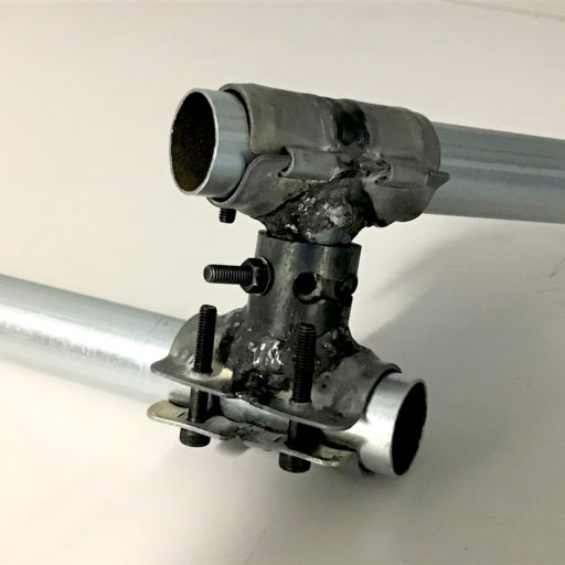 重要な役割を持つクランプは、基本的に2本のパイプをつなげる機能を持っている。各クランプは、1本ずつパイプを掴むことができ、その2本のパイプの角度を中央の関節部分を回転させ、調整することが出来る。そのクランプと、構造を補強させる構造を、一つのセットにし、体重を乗せられる構造になる。