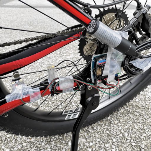 プログラムの動作が確認できれば、一式をRidge Runnerに取り付ける。本来の車輪の磁石は奥まった位置にあるので、磁気センサーに位置に合わせて新しい磁石をスポークに取り付ける。Arduinoにはモバイル・バッテリーで電源供給する。これらを養生テープでフレームに固定すれば出来上がり。冗談のようだが、動作を確認するだけなので構わない。ただし、ケーブルが絡まないように配慮しよう。