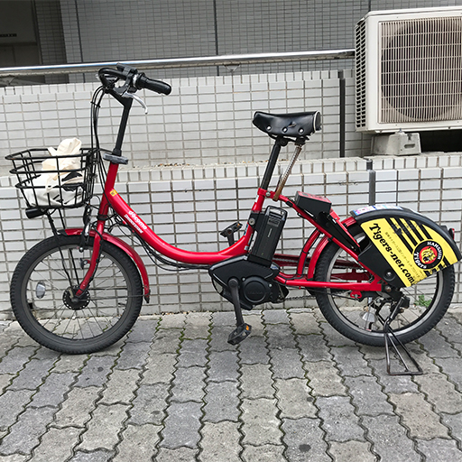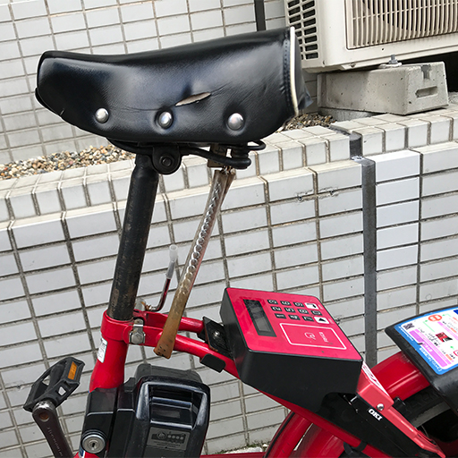 それぞれの車体に番号が割り振られており、どの車体を借りるかはオンラインでスマホから選択できる。迷わず阪神タイガース号を選んだ。サドルの高さを調整したいが、盗難防止のためかサドルがチェーンで固定されている。