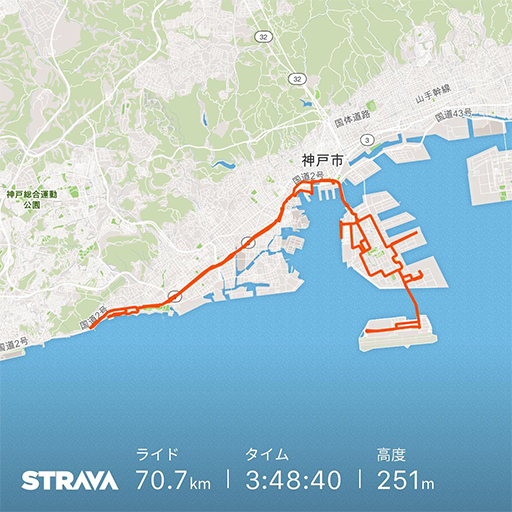 コミュニティーサイクルの「kobelin」に登録し、電動自転車を借りてライドした。残すは70kmということで、ポートアイランドを周り、神戸空港付近を見学して、須磨周辺の海沿いを走るルートを考えた。