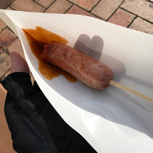 道の駅「星のふる里 ふじはし」でお昼休憩。年末の山ということもあって、開いているお店が少ない印象。冬季の長期休暇に入っているようだ。11時30分に蕎麦屋さんが開店とのことだったので、少し待って入ることにした。待っている間に森本工房のソーセージを食べる。