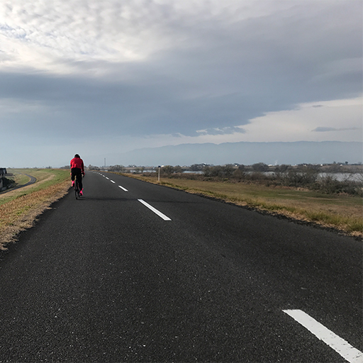 それにしても、川を挟んで西側と東側では天気が大きく違う。西側には、今にも雪が襲ってきそうな白い塊の雲が待機している。あの雲がこちらへ流れてこないうちに早く走ってしまいたい。明日の午前中にも70kmを走り、FESTIVE500を達成、午後には帰省する予定だ。