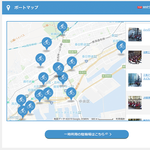 「kobelin」は有料のコミュニティーサイクルである。登録者は、ポートと呼ばれる駐輪場から、電動自転車を選び、借りることができる。返却は、借りたポートにだけではなく、ポートであればどこの場所に返却しても問題ない。つまり、用途に合わせて、ポートからポートへ乗り捨てるような使い方が可能なのだ。ただし、それぞれのポートには収容台数が決められており、規定の台数以上は返却することができない。
