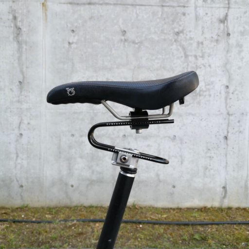 サドル自体のクッションではなく、サドルとシート・ポストの接合部に取り付けるサスペンションもある。どれが良いのか試し比べた訳ではないが、購入したのはjpfashioning社の安価な製品。「つ」の字型の弾力性のある金属レールが湾曲して振動を抑える。これは少なからず効果があるものの、少なからずフワフワと前後がピッチ運動する。曲芸じみた乗り心地は楽しくも、シリアスな用途には向かない。