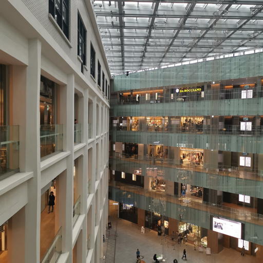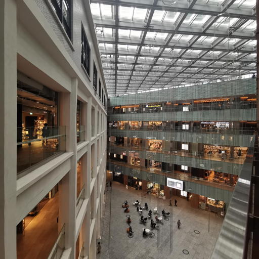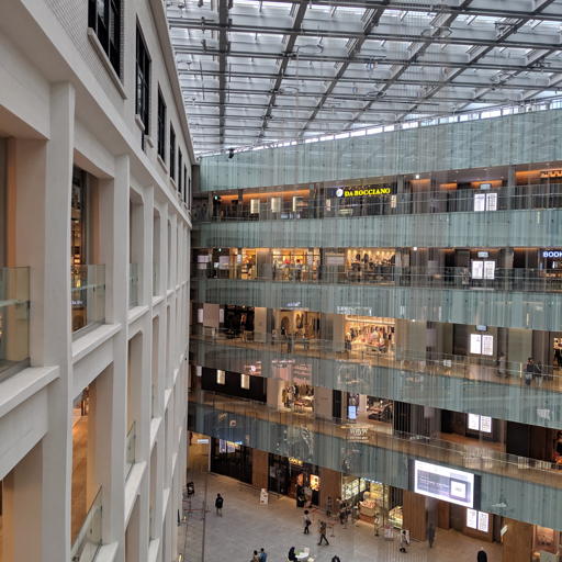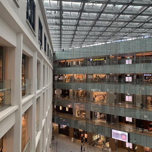商業ビルKITTEの4階から建物内部の吹き抜けを撮影。天井が半透明ガラスの人工的な環境。直線を多用した幾何学的で微細な空間を、いかにシャープに捉えるかが課題。