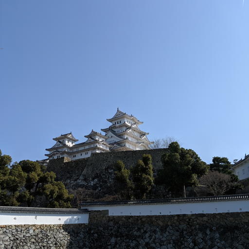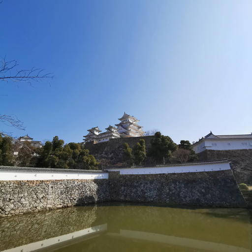 姫路城の天守閣を三国堀から臨んでの撮影。3月の晴天だったので、いずれもくっきりと細部まで描かれている。縮小表示ではMateの空のグラデーションが不自然に見える。