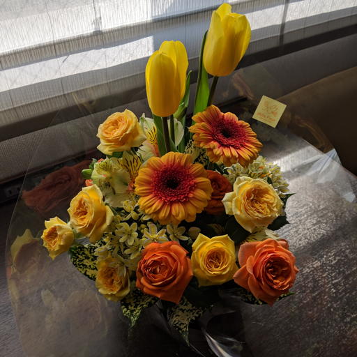 こちらは室内の窓辺に置いた花束を撮影。晴天の陽が薄いカーテン越しに差している。3機種それぞれ異なる雰囲気が現れている。生花にもかかわらず、造花のように見えるのが可笑しい。