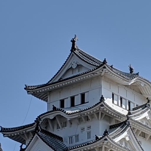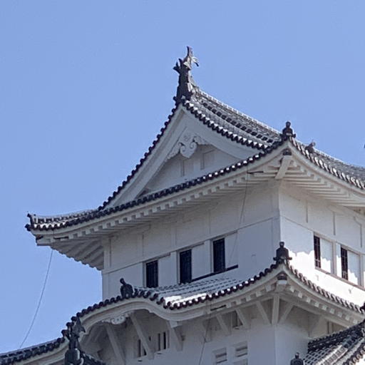 上記と同じ位置から最大限にズームして天守閣上部を撮影。iPhoneとMateは10倍、Pixelは倍率表示がない。ズーム・レンズを備えていてもデジタル・ズームとの併用になるので、その補正が見どころ。