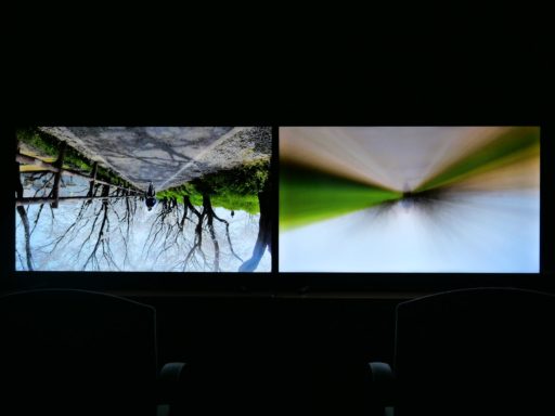 Vanishing Ride is a work of video art in which the camera approaches or moves away from a vanishing point by bicycle. The piece is composed of two contrasting videos. One of these was recorded using cameras attached to the front or the back of a bicycle. The vanishing point at the center of the receding landscape is clearly visible. The spatial and temporal movement of the footage is emphasized through time-lapse photography and by flipping the image vertically. The other video is made up of hundreds of frames taken from the first video’s footage superimposed and flipped horizontally. This video comes to resemble a painting that changes at an incredibly slow rate. The overall image is vague and obscure, and even the vanishing point vanishes. Each of these videos is shot in 4K UHD (3849 x 2160 pixels) at 30 fps. The two displays or screens are arranged side by side at the same height. Other arrangements are possible, but neither of the videos is ever displayed on its own. Starting with the “Ride to Fukushima Daiichi Nuclear Power Station,” I created a series of pieces using this visual structure. When talking about perspective, the “vanishing point” is the point on the visual field where parallel lines appear to converge.
