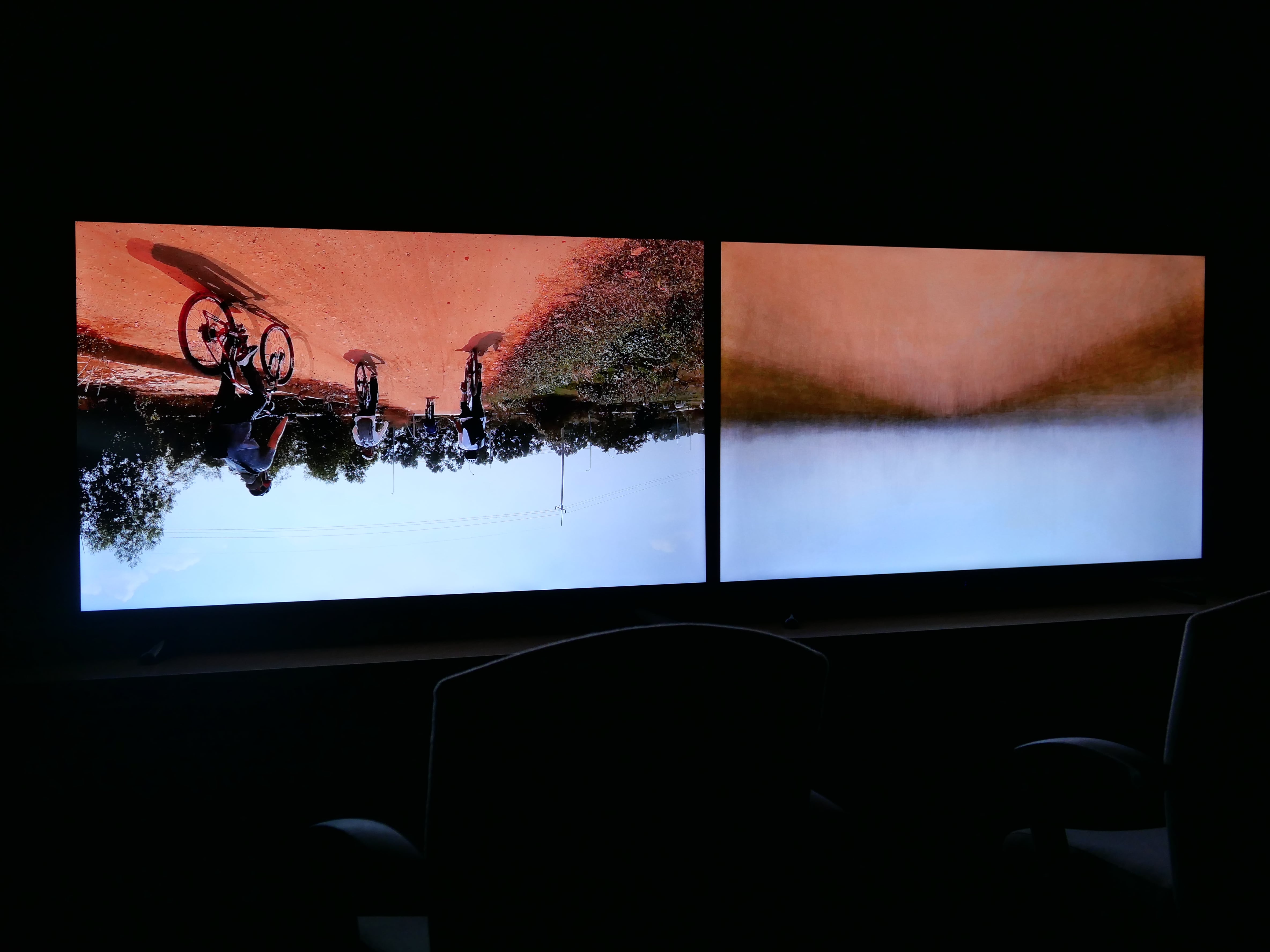 Vanishing Ride is a work of video art in which the camera approaches or moves away from a vanishing point by bicycle. The piece is composed of two contrasting videos. One of these was recorded using cameras attached to the front or the back of a bicycle. The vanishing point at the center of the receding landscape is clearly visible. The spatial and temporal movement of the footage is emphasized through time-lapse photography and by flipping the image vertically. The other video is made up of hundreds of frames taken from the first video’s footage superimposed and flipped horizontally. This video comes to resemble a painting that changes at an incredibly slow rate. The overall image is vague and obscure, and even the vanishing point vanishes. Each of these videos is shot in 4K UHD (3849 x 2160 pixels) at 30 fps. The two displays or screens are arranged side by side at the same height. Other arrangements are possible, but neither of the videos is ever displayed on its own. Starting with the “Ride to Fukushima Daiichi Nuclear Power Station,” I created a series of pieces using this visual structure. When talking about perspective, the “vanishing point” is the point on the visual field where parallel lines appear to converge.