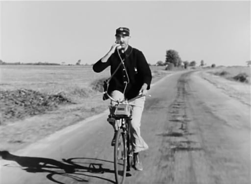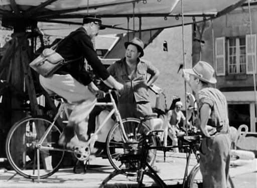 フランスの映画監督・俳優のジャック・タチ、その長編映画第一作「のんき大将脱線の巻」(1947年制作、1949年公開)は、全編に渡って自転車が重要なモチーフになっている。何しろタチ自身が演じる主人公フランソワは自転車に乗った郵便配達人なのだから。フランスの田舎町で繰り広げられる、ほのぼのとしたコメディ。シニカルさはオブラートに包まれている。