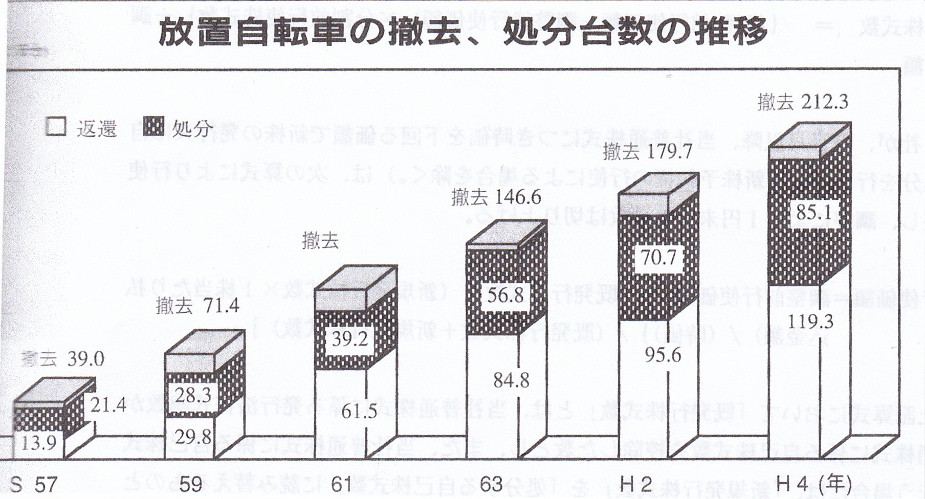 ついに93年、放置車対応に法的根拠を与える「新・自転車基本法」が制定され、放置車の回収・保管・廃棄処分に一定のルールができた。