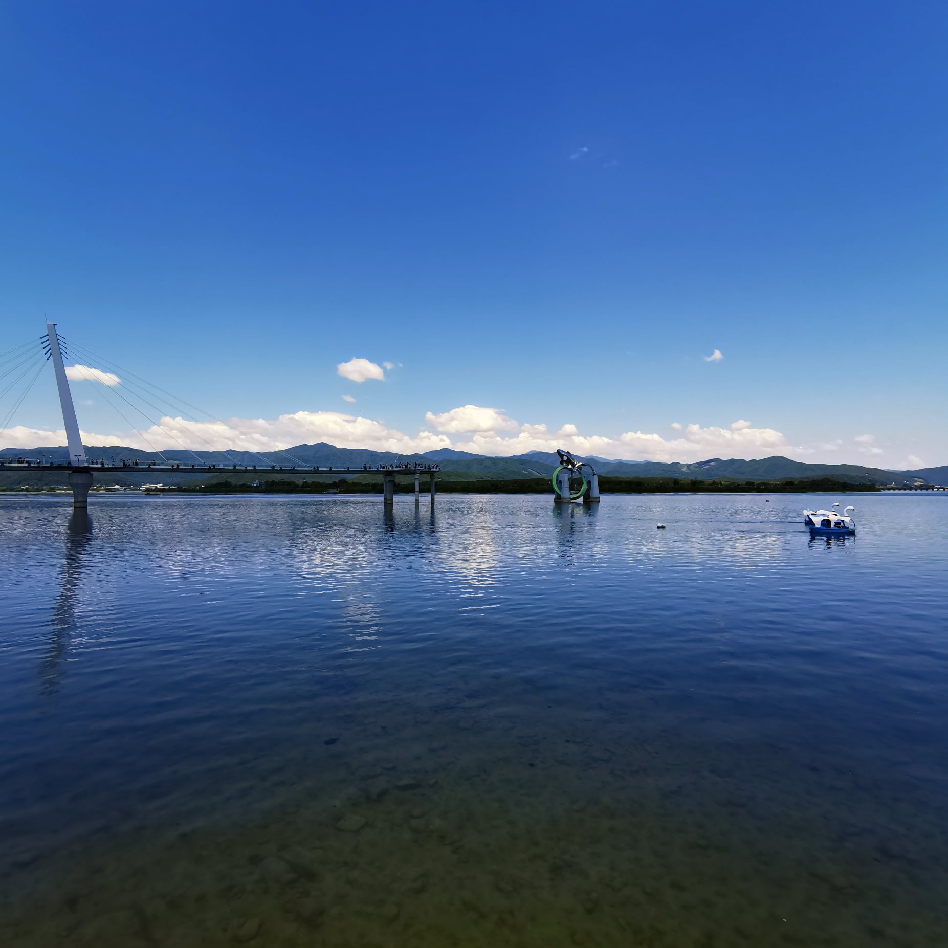チュンチョンでは名物のタッカルビをブランチとして食して、自転車ライドを始める。駅からすぐに川沿いの自転車専用道に入り、後はひたすら走り続ける。この自転車専用道は充分に広い道幅で路面も良く、周囲の素晴らしい風景と相まって快適に走行できる。川の水上や湿地帯に掛けられた木製の道では、敷き詰められた木片が発する走行音の快さが印象的だった。