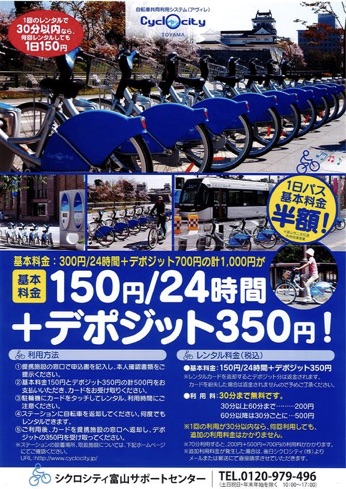 料金は、1日貸しの多い従来のレンタサイクルと異なり、ヴェリブの考えを取り入れ、30分無料・1時間100円と安く小刻みに設定。短時間利用に重点を置いた。