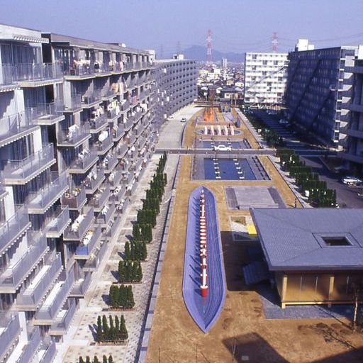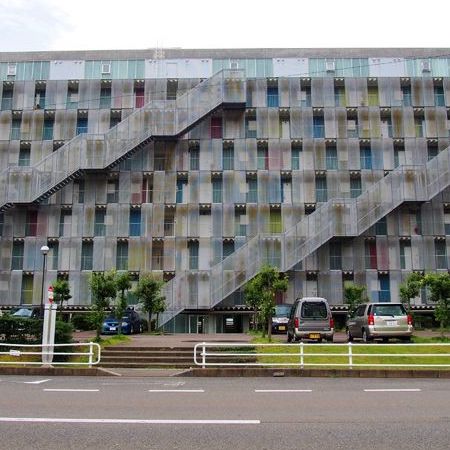 寄り道の目当ては、穂積駅から北に約3kmの本巣市北方町にある、岐阜県営住宅ハイタウン北方だ。磯崎新が女性建築家四人を選び、「ジェンダー」というテーマのもと、一人一棟ずつ(全430戸)を設計するというユニークなプランによって始まった。建築家は、高橋昌子、クリスティン・ホーリィ、エリザベス・ディラー、妹島和世の4名、造園設計士も 女性のマーサ・シュワルツを起用し、基本設計が行われた。