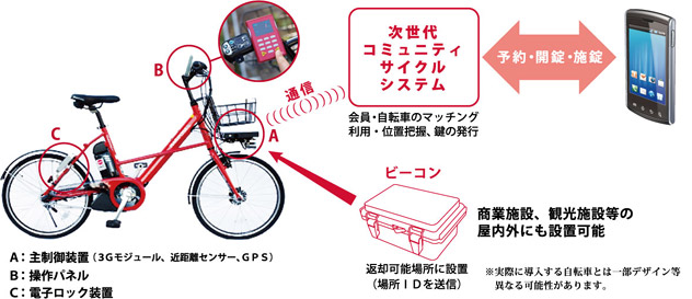 自転車本体に、通信・GPS・遠隔制御などの機能を一括搭載。予約・貸出・返却・決済・開錠などが容易にできた。