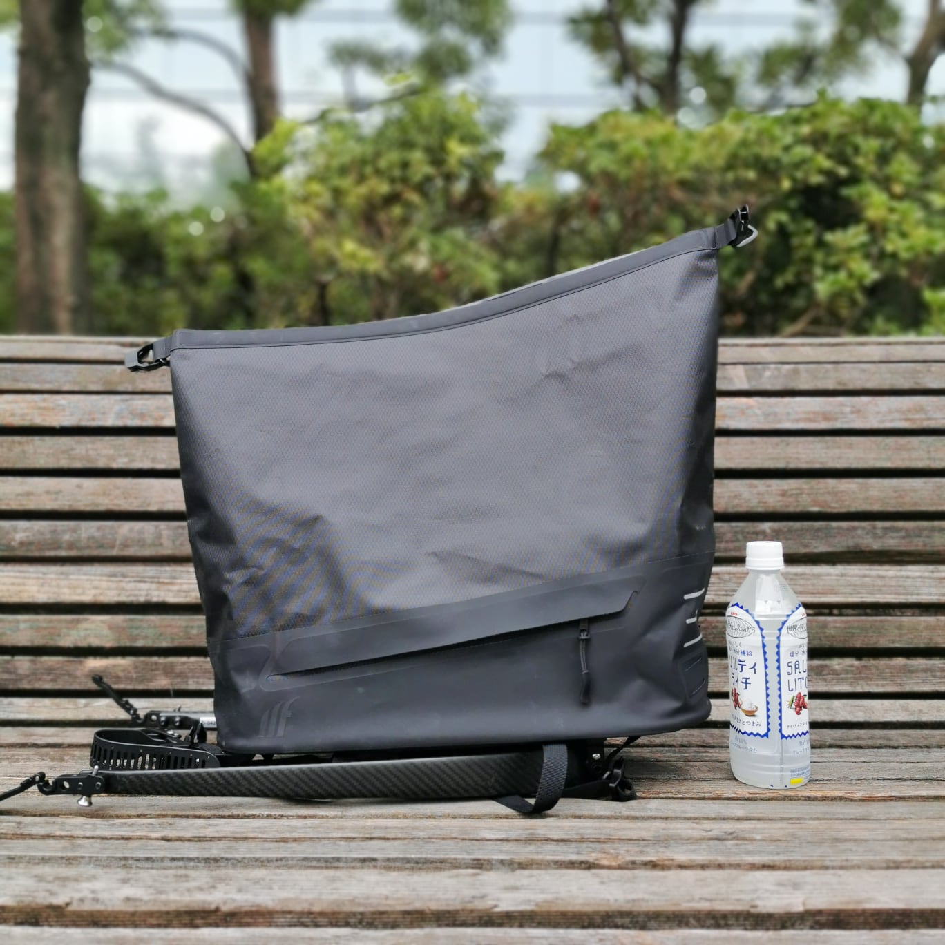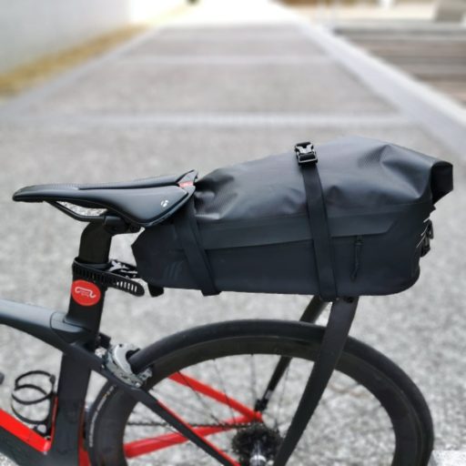 バッグはウルトラライト系の完全防水素材で、見た目にも美しい。上部をロールして閉じるが、両サイドに内部にアクセスできるジッパーと小物を入れるポケットが付いている。容量は20Lで、数字以上に大きく感じる。自転車からバッグを外すには、3ヵ所の固定具をワンタッチで解除するだけで簡単に行える。ただし、バッグに支柱が付いてまわるのがご愛嬌。