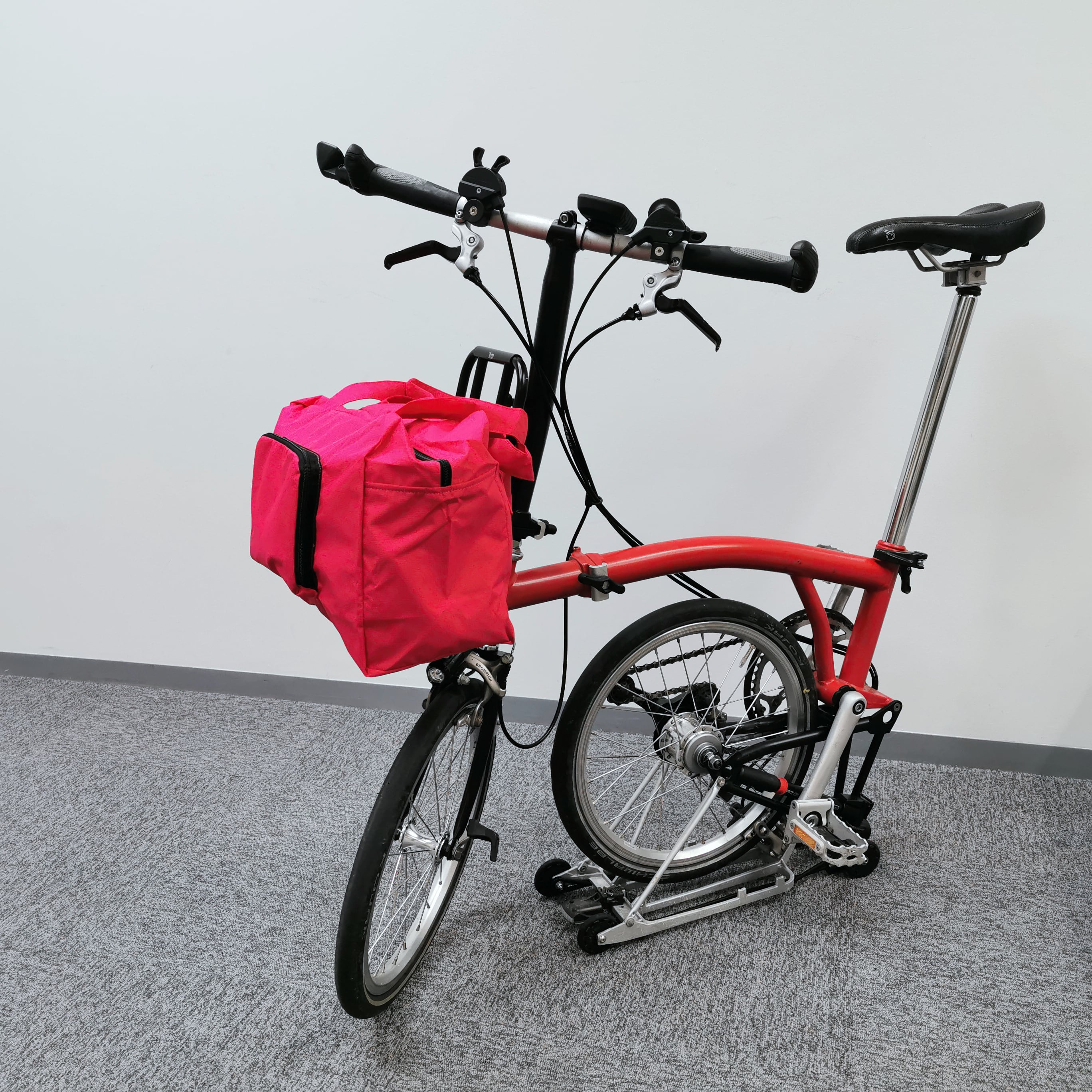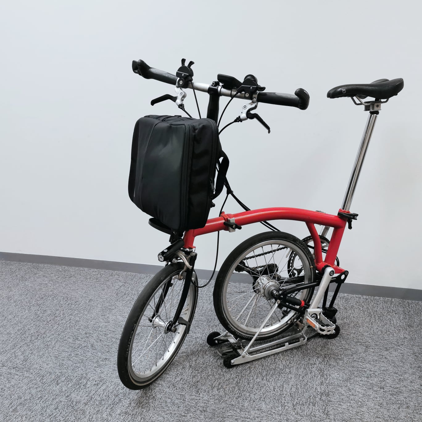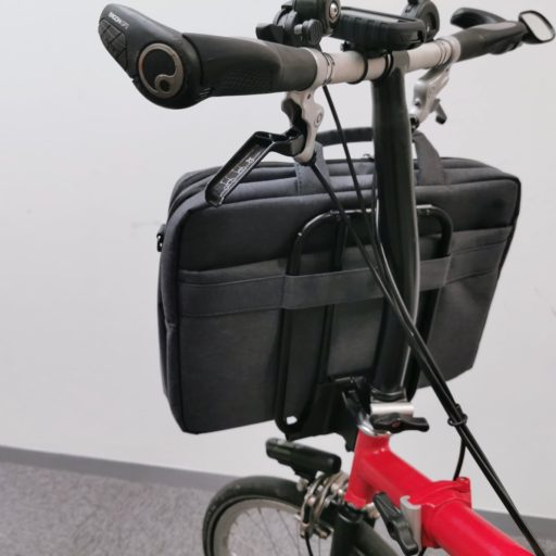 Brompton用フロント・バッグはワンタッチで着脱できて、重くてもハンドルを取られない優れた機構を持っている。これはバッグ底面の装着部でハンドルではなくフレームに装着するからだ。背面には堅牢なフレームが入っていて型崩れしない。このような専用バッグは使い勝手が良いものの、機構が嵩張り、価格が高く、種類が限られる。しかし、一定の条件を満たせば、専用ではないバッグも利用できる。
