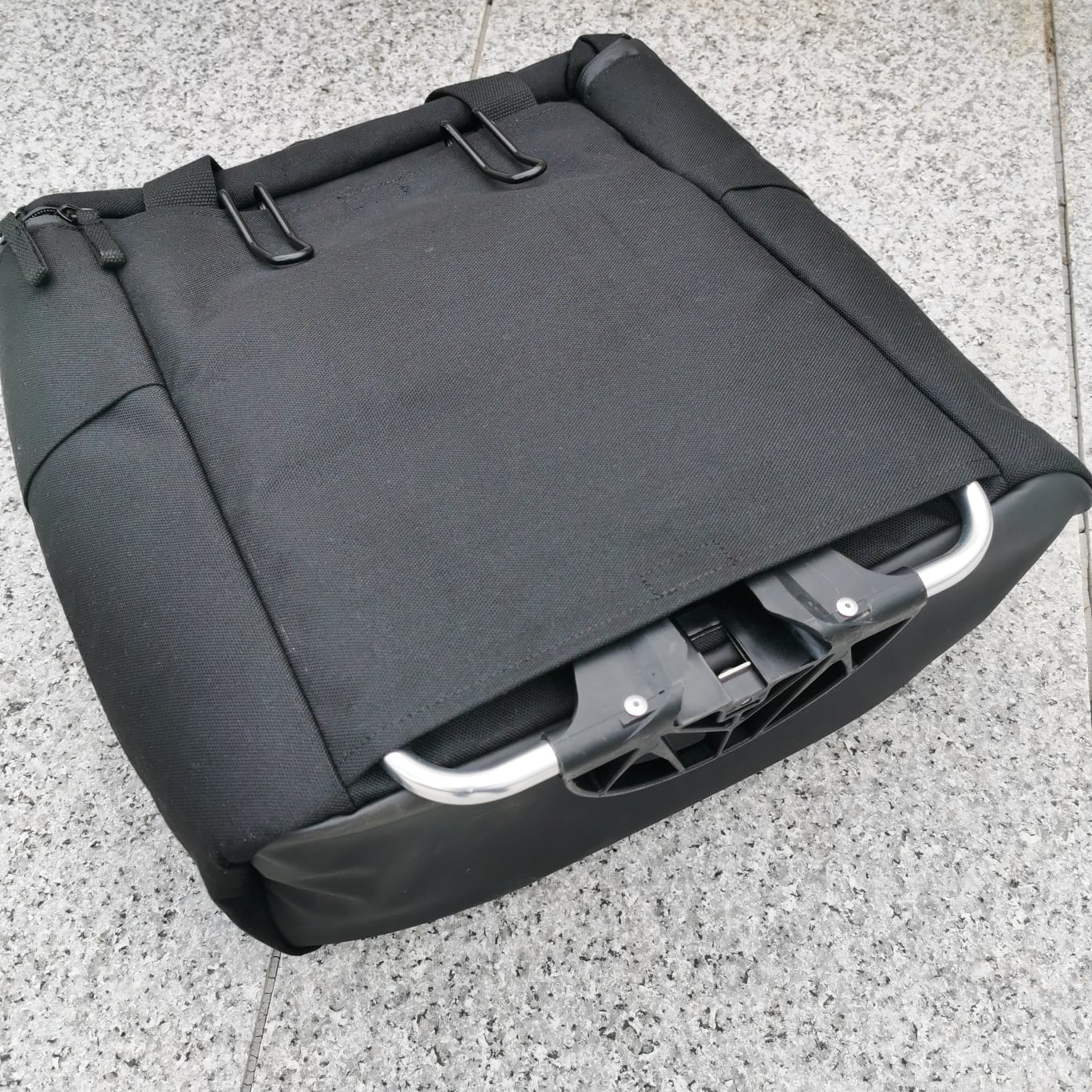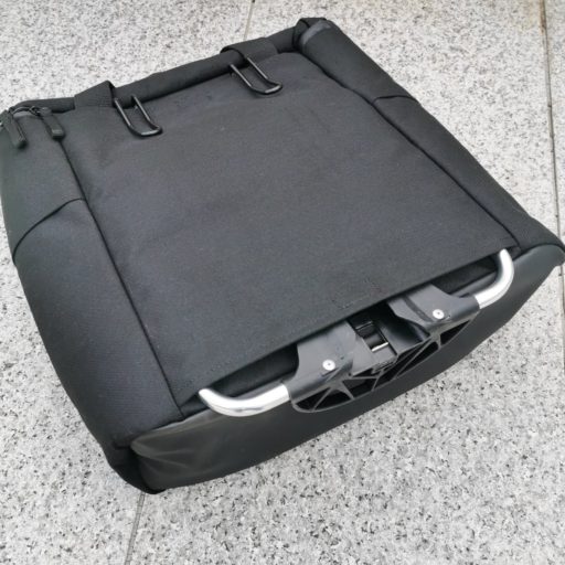 このことに気づいたのは、IKEAのSLADDA自転車用バッグ。このバッグの片面は上下が空いたカバー構造を持っている。これはスーツ・ケースのハンドルに固定するキャリー・オン機構だろう。その幅30cm弱。そこでBromptonトート・バッグのキャリア・フレームを抜き出せば、見事にSLADDAバッグにあてがうことができた。Sハンドルにはバッグの縦幅が大きいので、Mハンドル向きだろう。