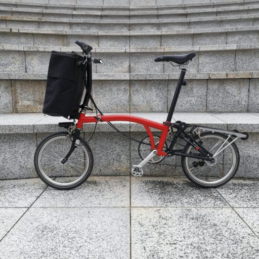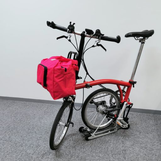 このようなバッグは、専用バッグのように背面全体にフレームが入っていないので、堅牢性には劣る。しかし、フレームから抜き出してバッグだけを持ち歩けるのは素晴らしい。偶然にも本日2019年10月12日に、折り畳み機構を中心としたBromptonの特許が時効となるらしい。純正の専用バッグだけでなく、ユニークなアイディアでフロント・キャリアが活用されることを期待したい。