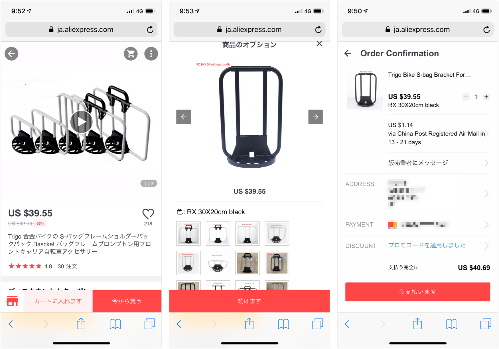 このキャリア・フレームは専用バッグから抜き出しても良いし、修理部品として購入することも可能。そして、キャリー・オン機構を持つカバンなら何でもBromptonで使えることになる。ただし、スーツケースのハンドルの幅は十数センチなので、バッグの開口部も同程度であることが多い。そこで、AliExpressで幅20cmの中華キャリア・フレームを購入した。価格も安い。流石である。