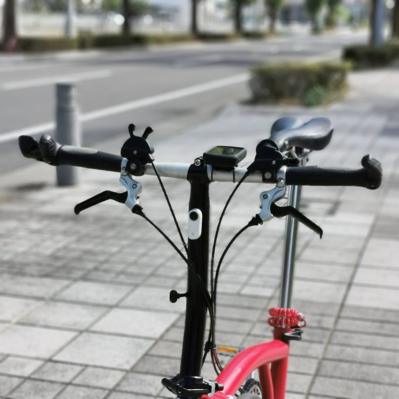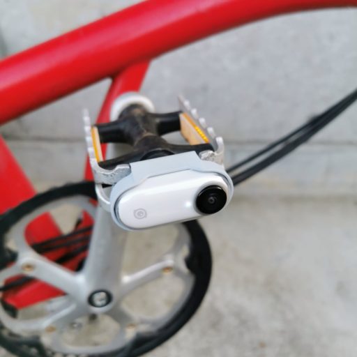 Insta360 Goの背面には磁石が埋め込まれているので、鉄などの金属にくっつく。鉄製パーツが多いBromptonなら、様々な場所で特別な画角の映像が得られる。曲面に横向きや斜めに取り付けると安定しない。通常の乗り方では外れることはなかったが、激しい動きも避けたほうが良いだろう。アルミやカーボンには吸着しないので、付属するクリップなどを利用する。