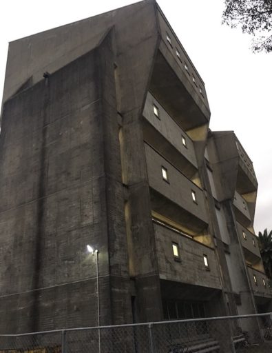 初めて訪ねる都市を日常のスケールに引き寄せてくれるのが、輪行の醍醐味だ。特に、自転車で下校途中の中高生に交じって舞鶴橋を渡り、岩田学園に到着した時の感慨は忘れられない。岩田学園は1964年に竣工され、現存する磯崎建築の中では最初期の作例であるが、その後増築され、今も変わらず使われているのだ。日が暮れかけ、教室の灯りが目立ち始め、コンクリートの壁とコントラストをなしていた。敷地内に様々な様式の校舎がゆったりと立ち並ぶ様子から、対話する建築と言われるのもうなずける。下校途中、川沿いのベンチに腰を下ろしておしゃべりしている中高生たちののどかな光景が印象に残った。