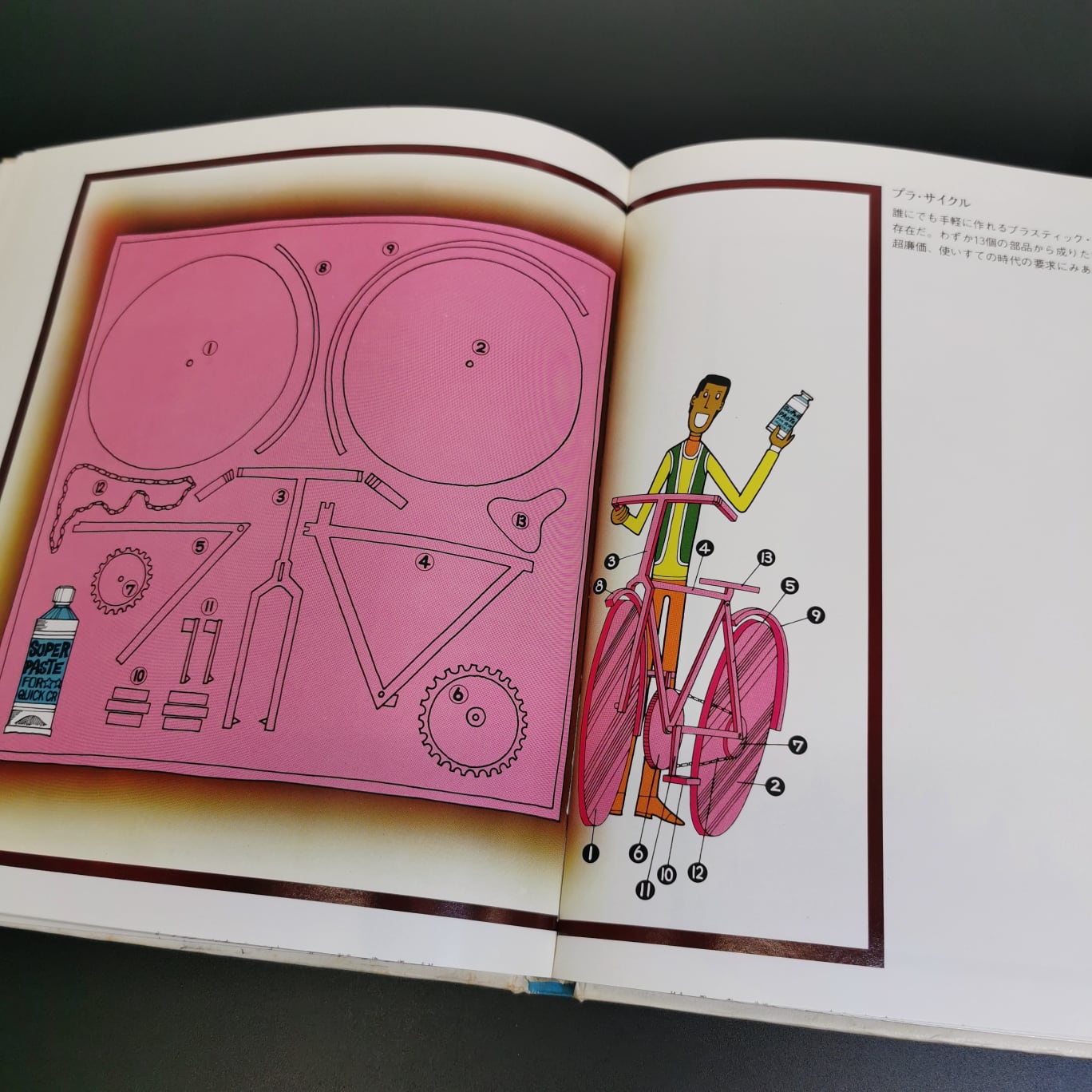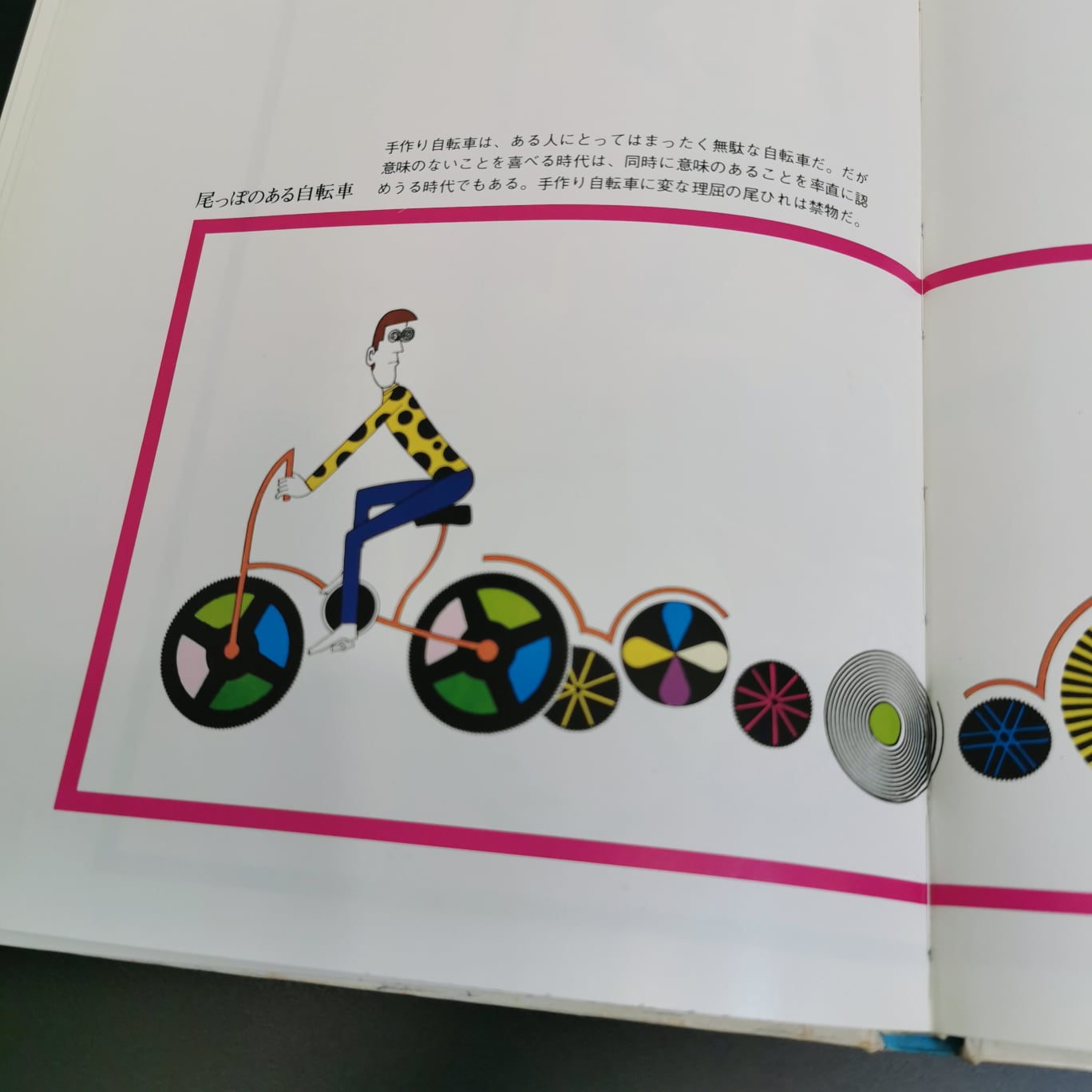 これらの自転車は単に面白可笑しいだけではない。それは続く16ページの文章で丁寧に説明される。人間の歩行速度(4km/h)と、自動車などの機械速度(100km/h)があまりにも掛け離れているので、様々な問題が起こっている。そこで、その中間にある自転車(20km/h)に注目しよう、と言うわけだ。そう、本書の副題「20キロ文明への憧れ」とは、自転車がもたらす可能性の追求に他ならない。