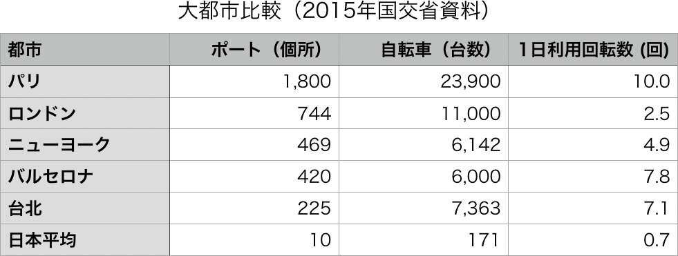 世界のシェア自転車は、観光利用を含めて、大都市の公共交通と定義付けられている。そのため規模が桁外れに大きい。