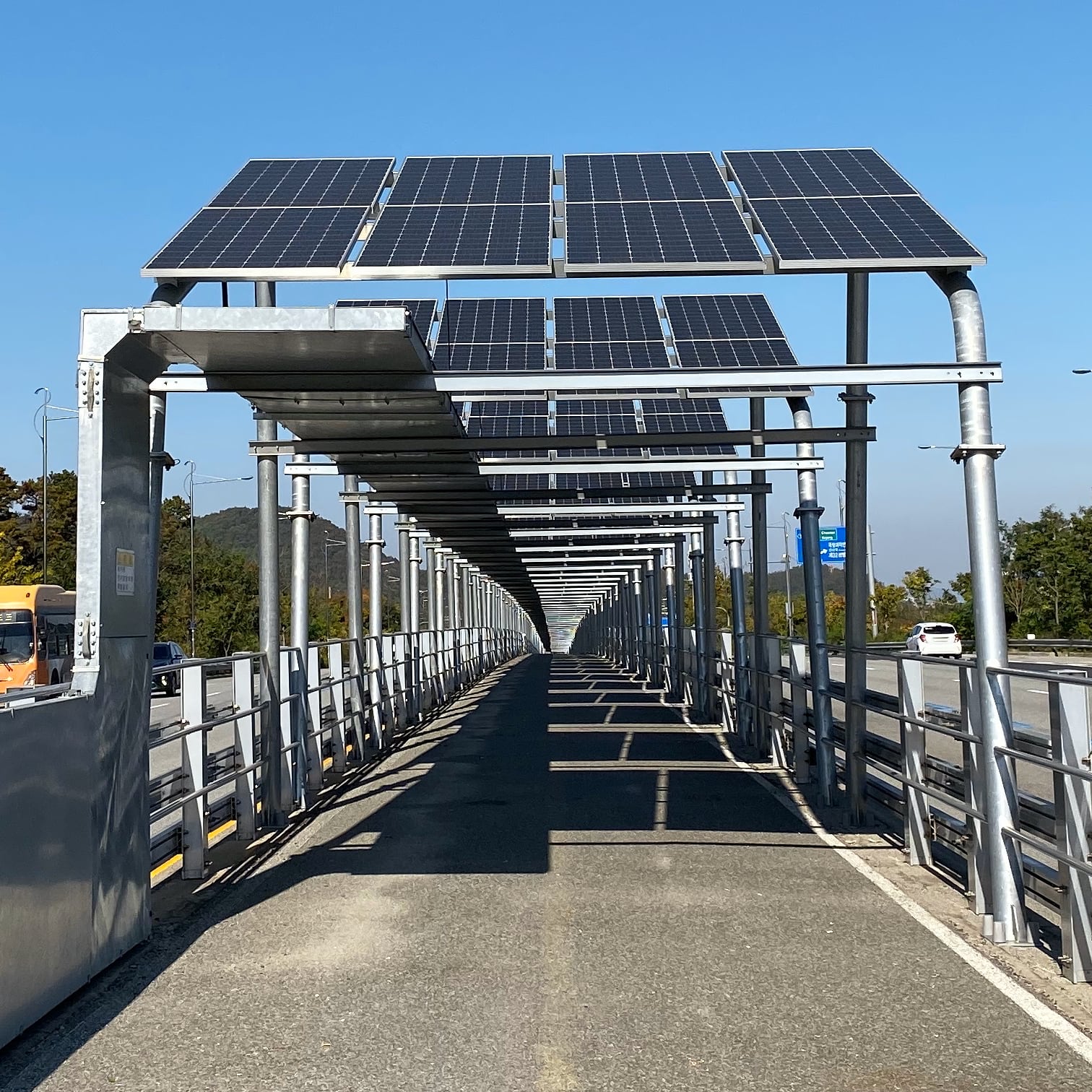 まず、テジョンを出発地として市街地のはずれにある自転車道に向かう。セジョン側もそうだが、出入口は信号機のある横断歩道を渡れば、ソーラー・パネルを戴く無数のアーチに迎えられる。幾何学的でリズミカルな構造体の中を疾走するのは何とも楽しい。左右を走る自動車もまたアクセントになる。懸念していた閉塞感はなく、騒音や排気ガスも気にならない。日差しや雨も防げると好印象。