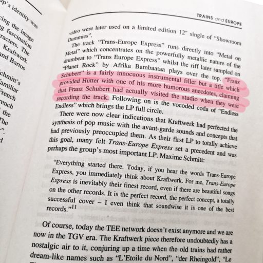 そもそも、ヨーロッパ横断鉄道網を主題とするアルバムに、短い生涯の多くをウィーンで過ごしたシューベルトが登場する理由が分からない。楽曲としては前後の繋がりが完璧なだけに、曲目だけが唐突に思える。パスカル・ビュッシー(Pascal Bussy)のクラフトワーク本でも、この曲をレコーディング中に同姓同名の人物がスタジオに来たというエピソードが紹介されているだけだ。