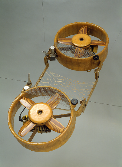 技術への素直な関心が窺えるのが《スイスの自転車》(1967)だとすれば、全く異なるアプローチの飛行装置として構想されたのが《二翼(飛ぶ自転車)》(1974)だ。この自転車は昆虫の羽のような翼に特徴があるが、パナマレンコはしばしばハイブリッドなモチーフによって機械の概念を揺さぶっている。後に発表された「始祖鳥」(1990)のシリーズは、鳥と爬虫類、機械の境界を取り払ったモチーフで、太陽エネルギーにより動き、学習性をもつ作品として発展させている。
