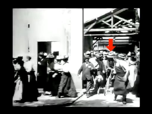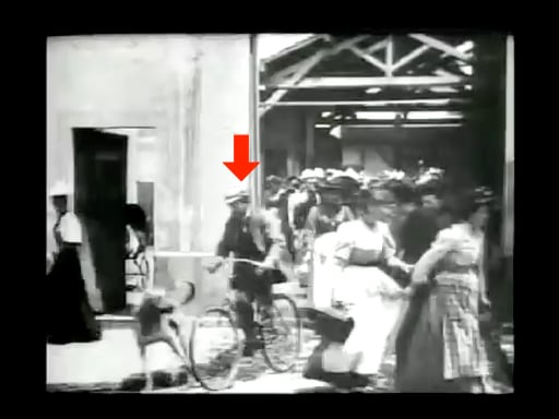 さて、いずれの「工場の出口」においても退出する人物の大半が女性で、ロング・スカート姿が時代がかっている。一方、自転車を利用しているのは男性ばかりであり、服装も自転車も違和感が少ない。初心者なのか横から支えられたり、無愛想な乗り手が脇を小突かれたりしている。さらには子供を乗せて転倒しかかるなど、今日と変わらぬ微笑ましい情景が僅かな時間の中に見て取れる。