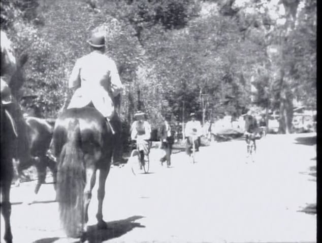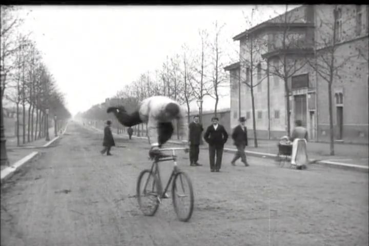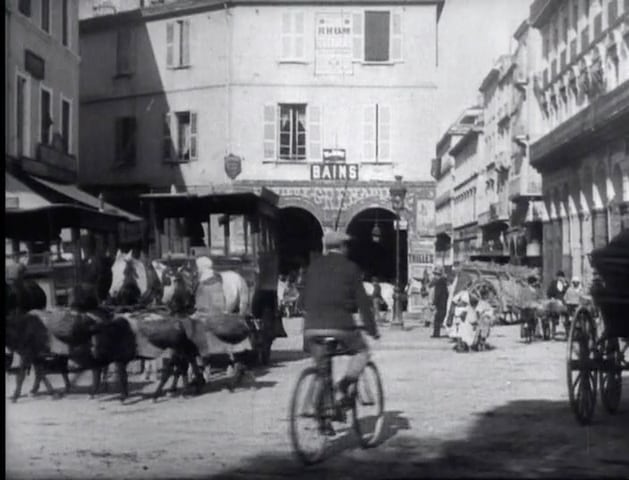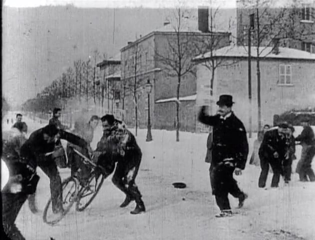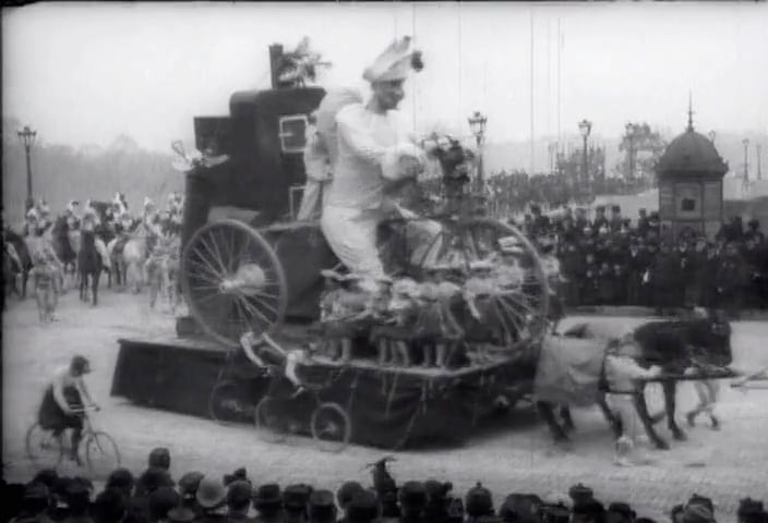 他にもリュミエール兄弟の映画には数多く自転車が登場する。しかも特異な存在ではなく、街に溶け込み(1209)、曲乗り(17)や雪合戦(101)も行われる。一方、レース(33)やパレード(1094)が開催され、カーニバルの巨大な山車(151)など、華やかなイベントも多かったようだ。数は少ないが女性が自転車に乗る姿(247)もある。いずれもすべてセーフティ型だ。(数字は作品番号)