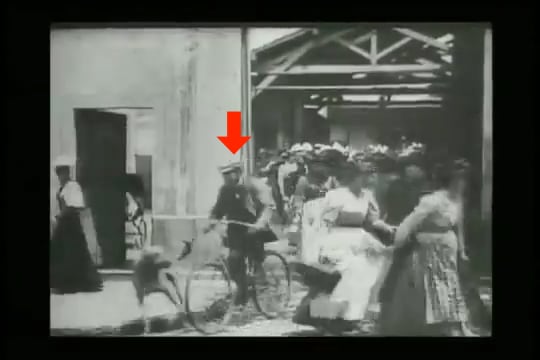 さて、いずれの「工場の出口」においても退出する人物の大半が女性で、ロング・スカート姿が時代がかっている。一方、自転車を利用しているのは男性ばかりであり、服装も自転車も違和感が少ない。初心者なのか横から支えられたり、無愛想な乗り手が脇を小突かれたりしている。さらには子供を乗せて転倒しかかるなど、今日と変わらぬ微笑ましい情景が僅かな時間の中に見て取れる。