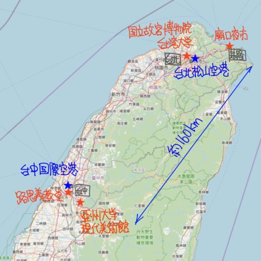 行きたい場所を地図上にプロットしていく。今回は候補が集中している台北、台中を中心に旅程をプランニングすることにしよう。スタート地点は台北松山空港、ゴール地点を台中国際空港とし、これを起点にして地図に大まかに計画を書いてみる。
