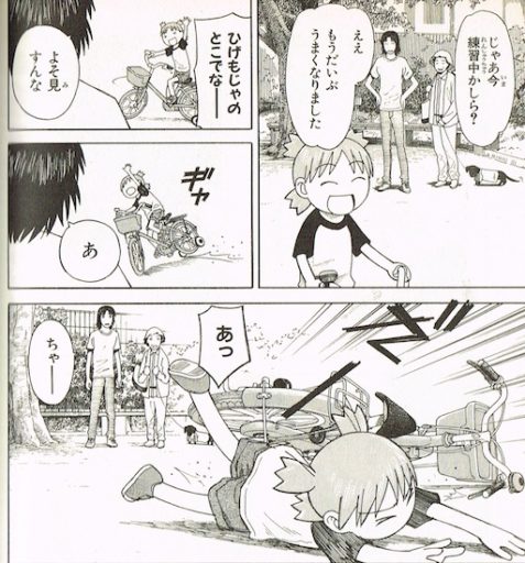 『よつばと!』では、よつばの視点を中心とした描写を通して、読者が知らず知らずのうちに物語の構成に必要な情報を選び取っていくのだが、このようなシーンに出くわすと、まだ物語の基本的な設定すら知らなかったのだと打ちのめされる。と同時に、そこには世界との関係を記述するための情報の束を読者が主体的に模索していくようなリアリティがある。自転車の例にしてもそうだが、商標を特定できる描写が多いのもこの漫画の特徴だ。日常系漫画の中に、差異と分節化を見出すプロセスをもちこむことで、ミクロな視点から世界認識の方法を想像させるのに一役買っているのではないだろうか。