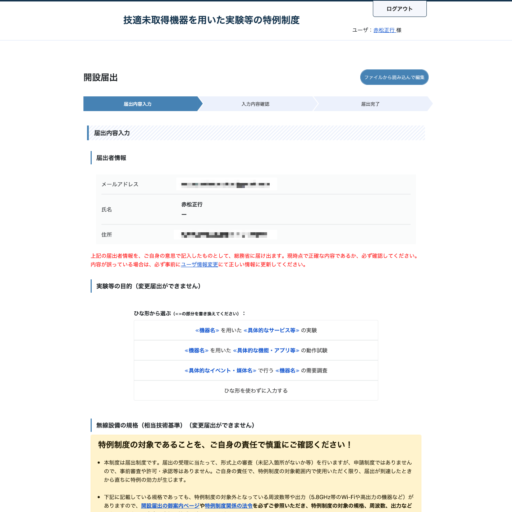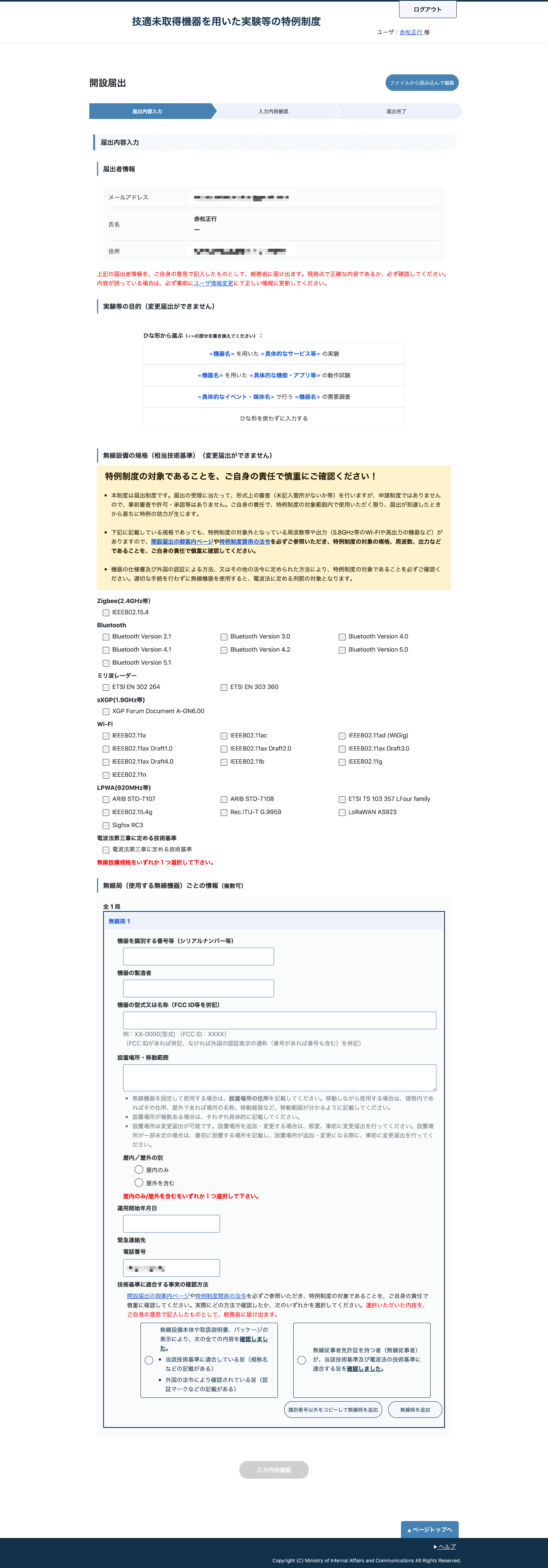 この届出は本人の責任において行うものであり、何らかの審査や許諾があるわけではない。ただし、「Huawei P40 Pro 5Gを用いた5G通信サービスの実験」を実験等の目的として届け出たところ、翌日総務省から電話がかかってきた。この特例制度は5Gを対象としていないので、Wi-Fiなどを実験目的として欲しいと言う。しかも、ユーザ修正ができないので総務省で届出を書き換える出血サービスぶりだ。