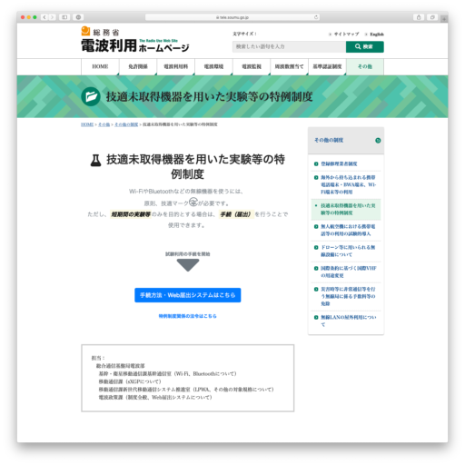 この特例制度は、海外の製品が当該国での認証を受けていれば、短期間の実験や調査のための使用を認めるものだ。Wi-FiやBluetoothなどは国際標準規格であり、国ごとに仕様が違うわけではないから、妥当な運用だろう。むしろ届出を不要にして用途や期間も限定すべきでないと思うが、そこまで柔軟ではない。ともあれ、WEBサイトのフローチャートで制度の対象であるか否かを判断できる。