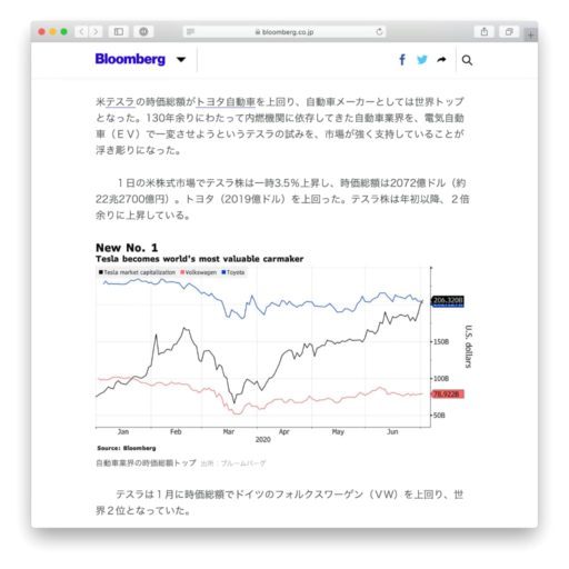 一昨日、つまり2020年7月1日にテスラ(Tesla)の時価総額がトヨタを上回り、自動車業界のトップに立った。テスラはアメリカの電気自動車(EV)メーカーとして有名だが、その販売台数はトヨタの3%程度しかない。つまり、僅かな数の自動車しか売っていないにも関わらず、世界でもっとも価値が高い自動車メーカーになったわけだ。これは自動車業界の新旧交代を鮮烈に印象付けている。