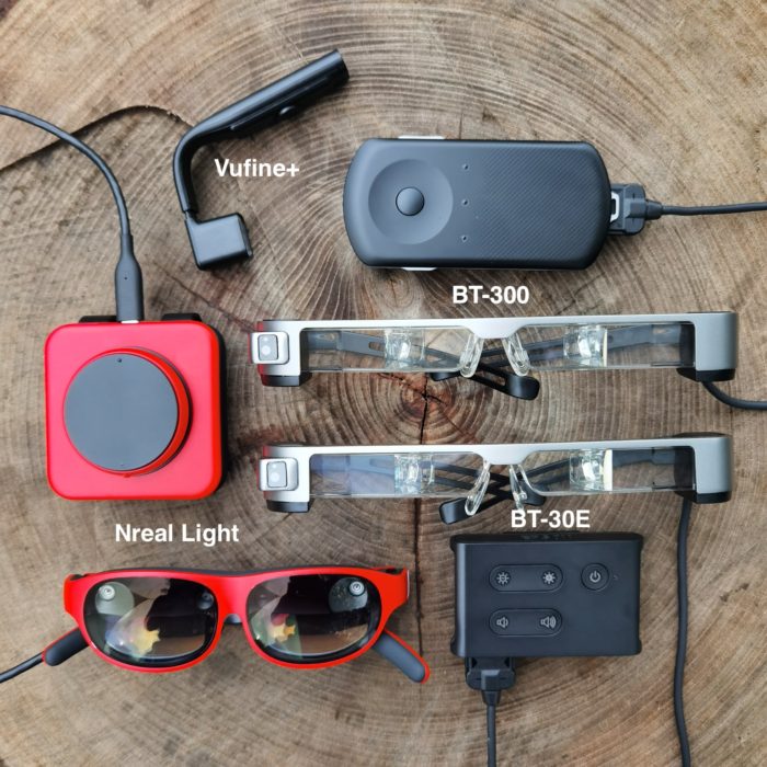 エプソンのBT-30Eは眼鏡型のシースルー・ディスプレイで、Vufine+と同じく外部から入力した映像を表示する。サイドから投射する映像を目の前のハーフミラーで反射させるので、映像が眼前の光景に溶け込んだように見える。HMDIも使えるが、USB-Cで接続すればヘッドセットのカメラ映像やモーション・データを取得できる。これによってARや遠隔診断といった用途も想定されている。