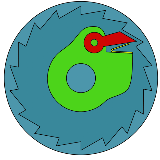 このようなラチェットという機構によって一方向の向きの時にだけ回転するのがフリーギアだ。細かい説明は省くが、おおよそこの図をみて、どちらに回転すると赤い部分が引っかかるか、引っかからずに回るか、というのをイメージしてもらいたい。