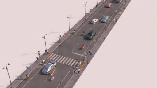 このようにして完成した街角は道路ではなく広場に見える。ゆっくりと移動する自動車は乗合のミニバスや物品販売のワゴン車のようだ。郊外の道路では高速に自動車が走っていそうだが、それは自動運転であり、生活の主役ではない。これは、Fun To Driveと嘯いて人々に運転を強要し、多大な交通事故を引き起こしてきたトヨタの改悛だろうか。我が物顔の自動車が望まれていないことは確かだ。