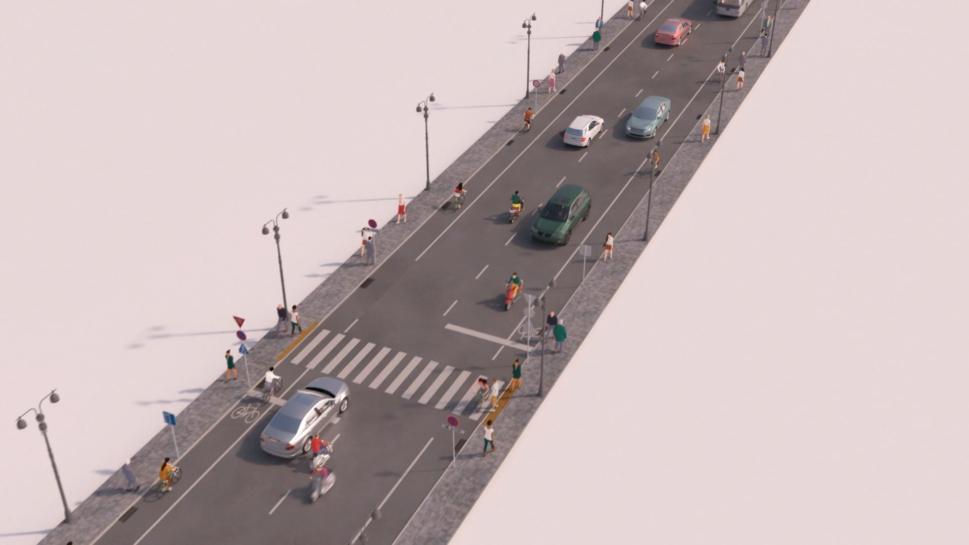 それではトヨタが理想とする未来都市において、どのような移動が考えられているのだろうか、特に自転車の扱いが気になる。まず、イメージ・ビデオでは現状の描写から始まる。舗装された往復二車線(片側一車線)の自動車道路、車道の端は白線を引いただけの自転車レーン、そしてタイル敷きの歩道が密接している。全体として過密気味で混沌としているが、実際の日本の都市部よりはマシかもしれない。