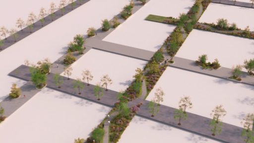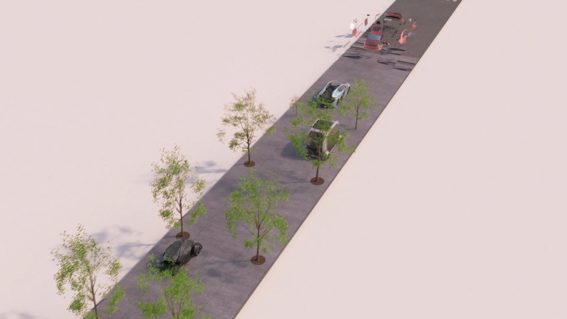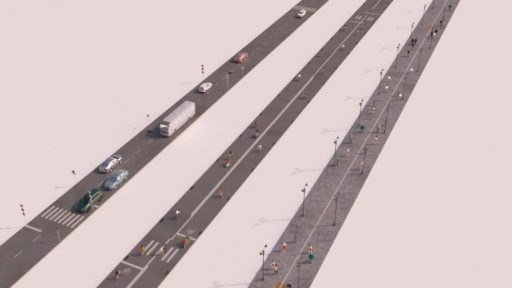 これはイイなと思ったのも束の間、舗装された自動車道路にタイルが敷かれ、中央線が消え、街路樹が現れる。自動車も何やら有機体っぽい形状に変わる。タイルはプラスティックごみを再生した耐久性のある高機能モジュールだろうか。頑丈で設置や保守が容易であるだけでなく、各種センサーを備え、発電および車両や機器へのワイヤレス給電機能を持つに違いない。