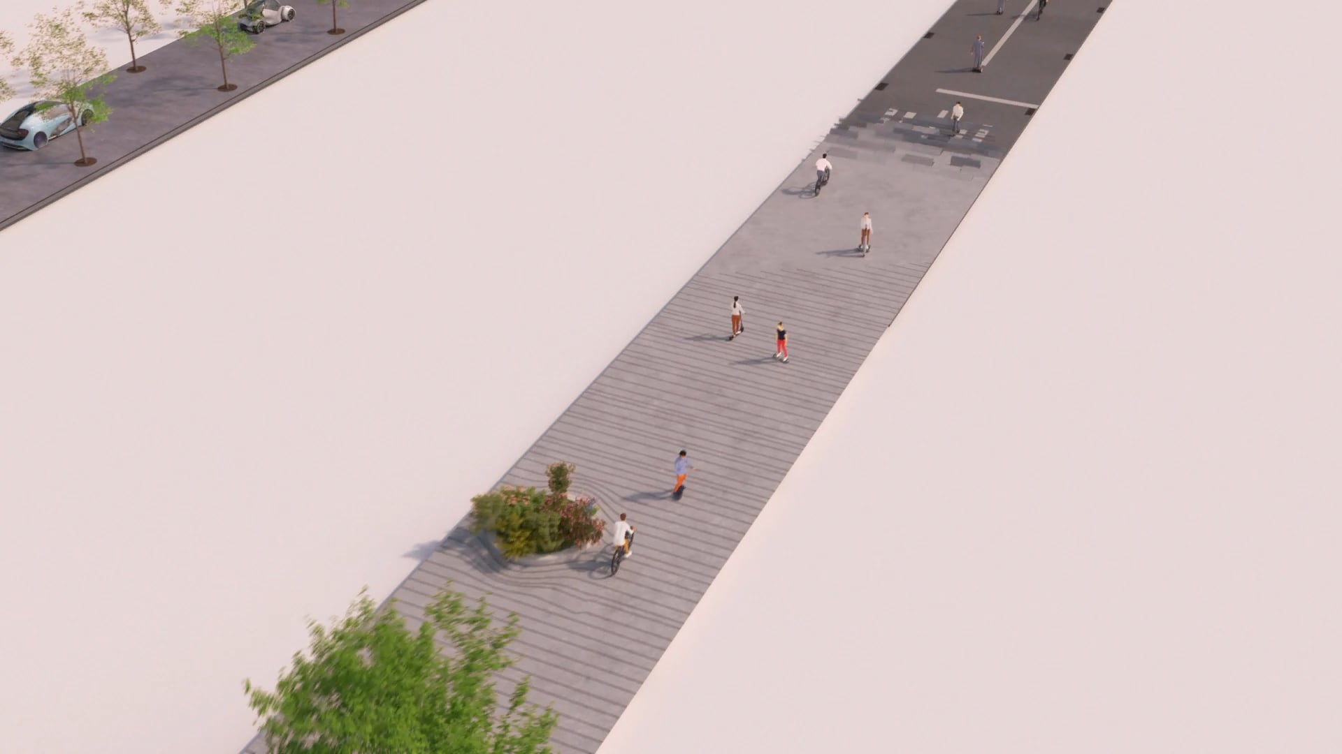 間髪入れず、自転車道もタイル敷きになり、大きな植え込みが並ぶ。自動車道の街路樹や自転車の植え込みは、相対的に走行空間を狭くしてしまう。しかし、センサーによって周囲を監視し、衝突を回避して効率的な走行ができるのだろう。既にオートバイは消滅しており、自転車も数が減って、唐突にローラースケートやキックボードらしき直立移動者が目立つようになる。