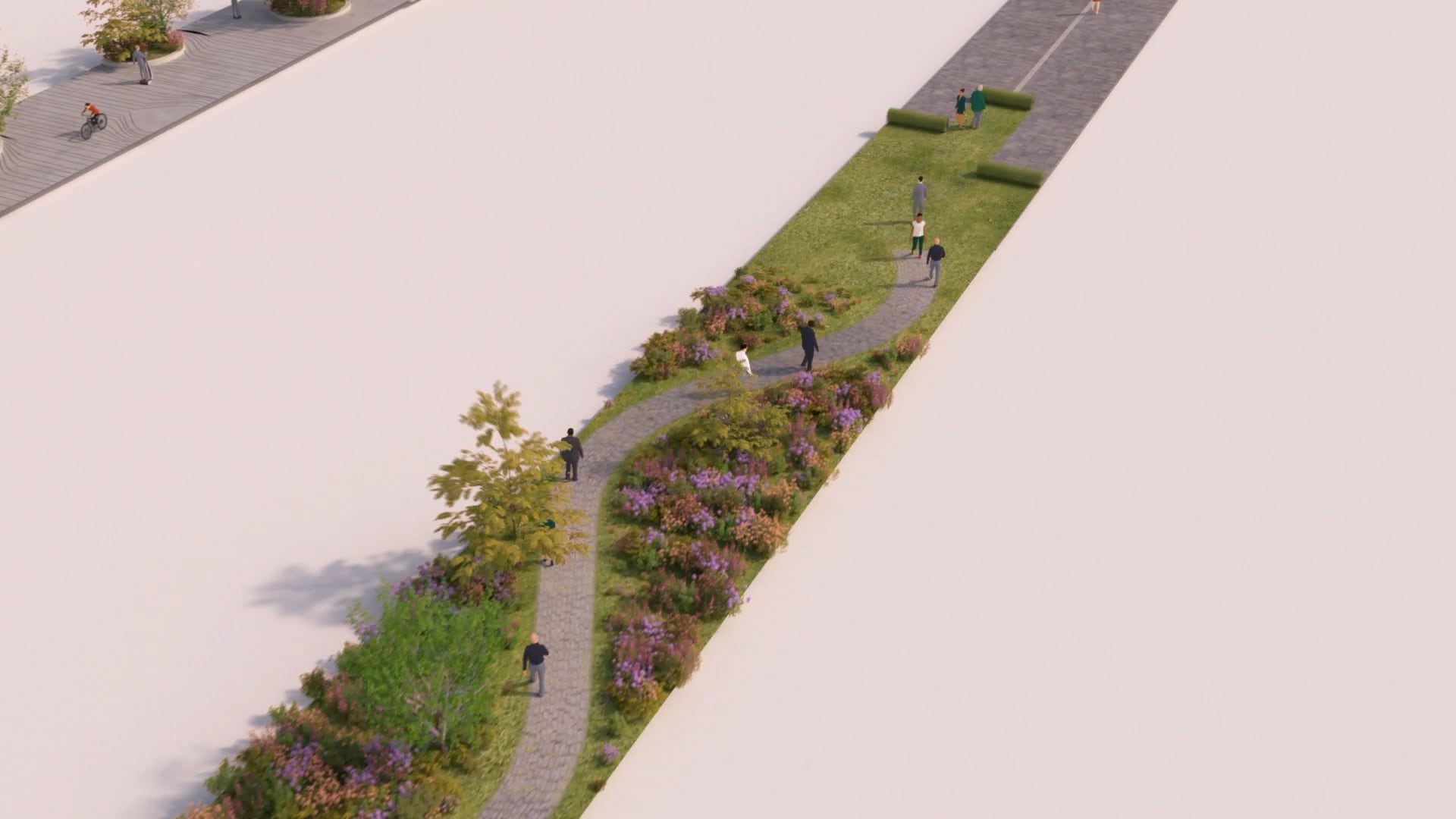 さらに歩道には人工芝のカーペットが敷かれ、公園のように植え込みが生い茂り、その中を蛇行する遊歩道が現れる。自転車道もそうであるように、直進性が失われ移動効率が悪くなっている。のんびりフラフラと散歩を楽しもうと言いたいのかもしれないが、自動車道だけは直進性を保っていたことを思い出そう。ここでも自動車を最優先とするトヨタの陰謀が見え隠れしている。