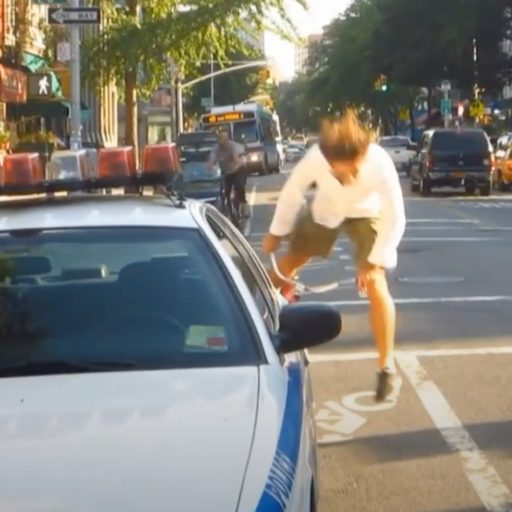 猪突猛進とはこのことだ。怪我をしないか心配になるほど豪快に障害物に突っ込み、派手に転倒して転げ回る。なぜなら標識や荷物が自転車レーンに無造作に置かれ、タクシーやパトカーは自転車レーンに停車しているからだ。自転車で自転車レーンを走ればどうなるかを、ケイシーは身を以て見事に見せつけている。そう、自転車で自転車レーンを走ることは不可能なのだ。